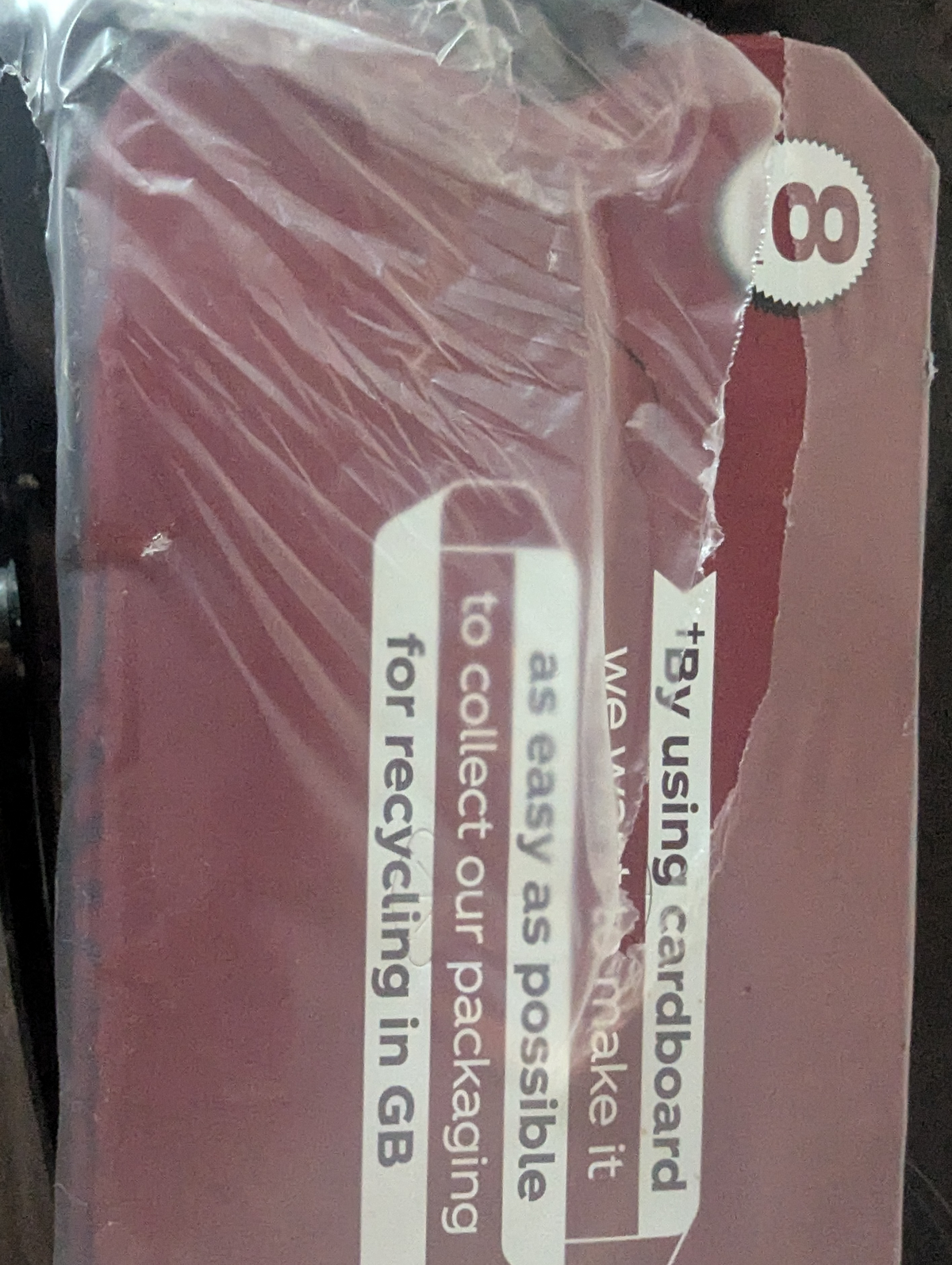 More cardboard, less plastic—except for this cryptic corner that still clings on. Maybe next time we’ll break up with plastic for good. It’s like eco-packaging with one foot on each side of the environmental fence.