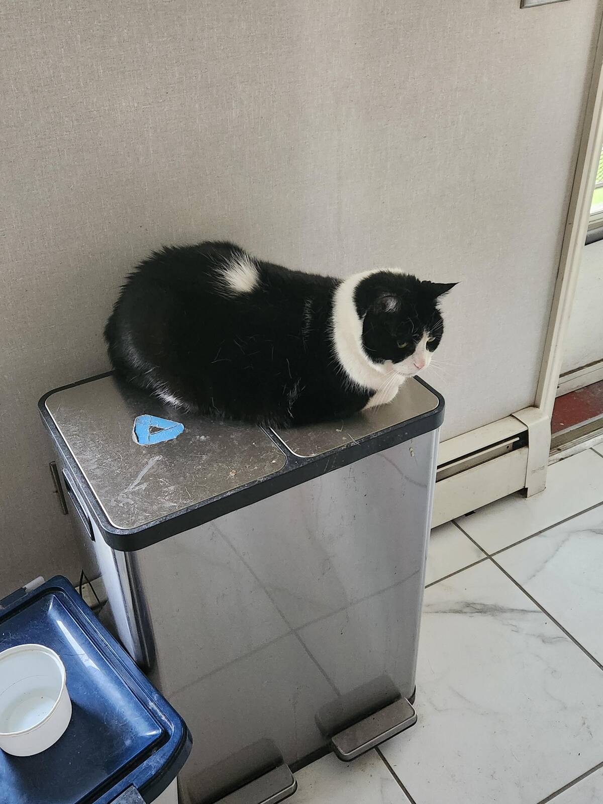 Security measures are tight around the trash can today. Not a single scrap is getting past this formidable guard. Attempt an unsanctioned disposal and you’ll answer to the ultimate enforcer—maybe with a side of dramatic meows.