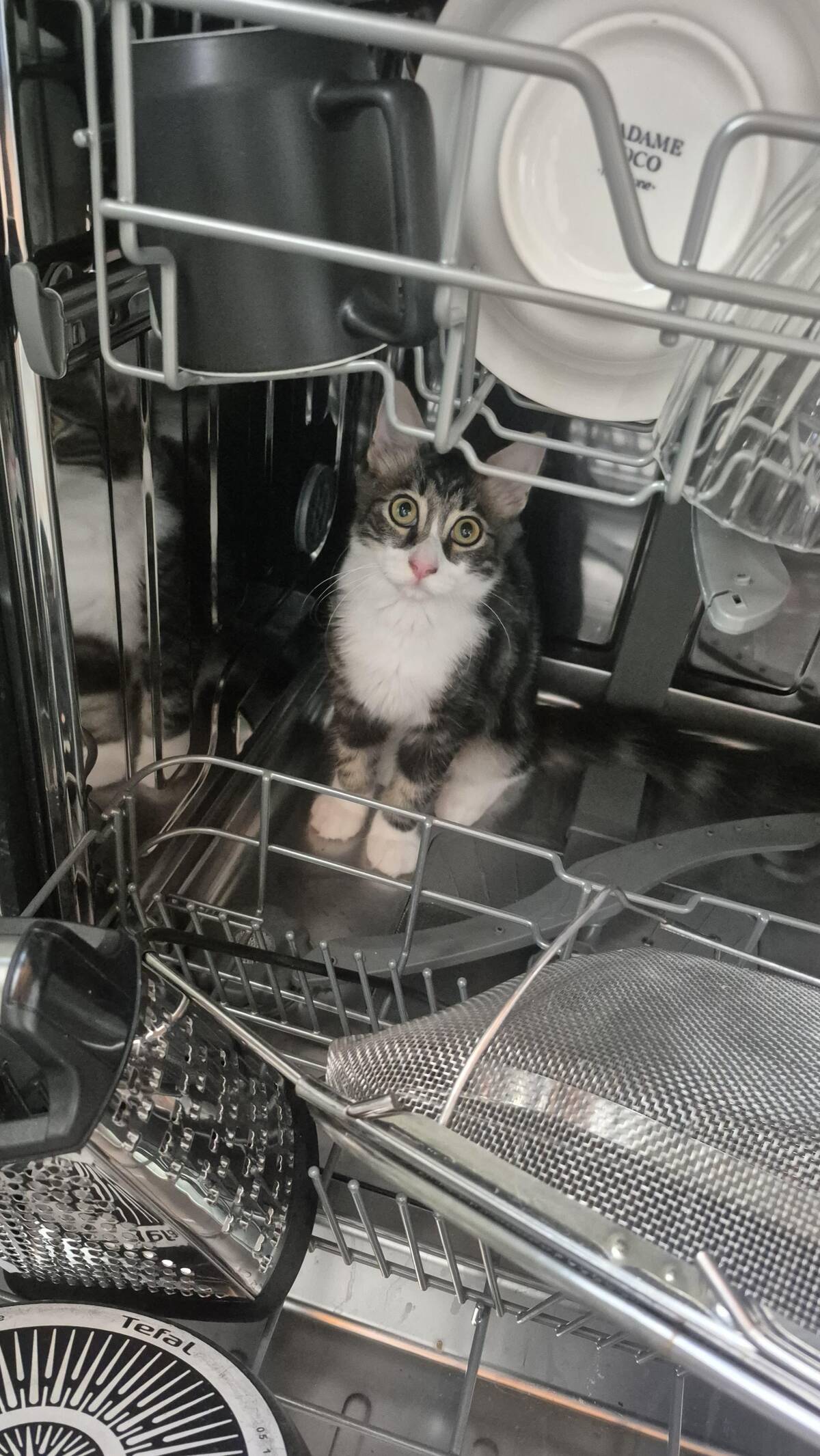 I never knew dishwashers came with fluffy assistants! Seems like they’re double-checking if everything is really clean. Those big eyes look very invested in kitchen hygiene. Next time you hear clinking in the dishwasher, expect an enthusiastic report from the team.