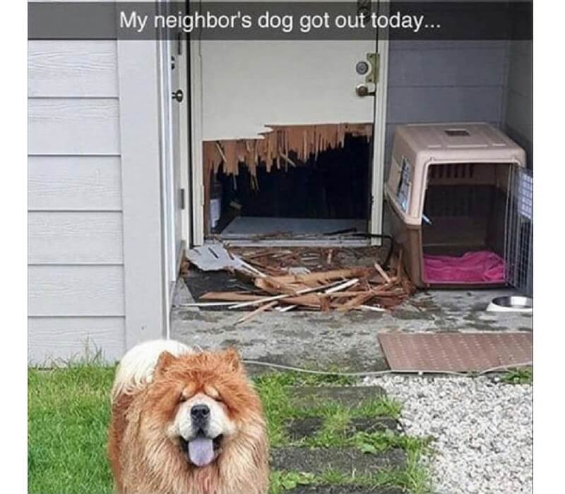 He didn’t intend to break the door, but the call of the green grass was too strong to resist. Just a good dog with a big dream.