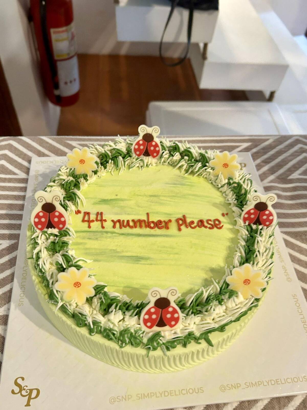 “44 number please” – ask and ye shall receive! This cake is a masterclass in trusting the system and watching it go delightfully wrong. The ladybugs and flowers are doing their best to distract from the existential cake message in the center. Pure birthday magic.