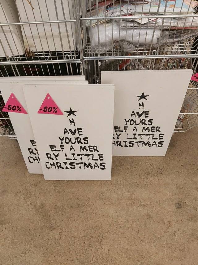 christmas sign, word split up backwards