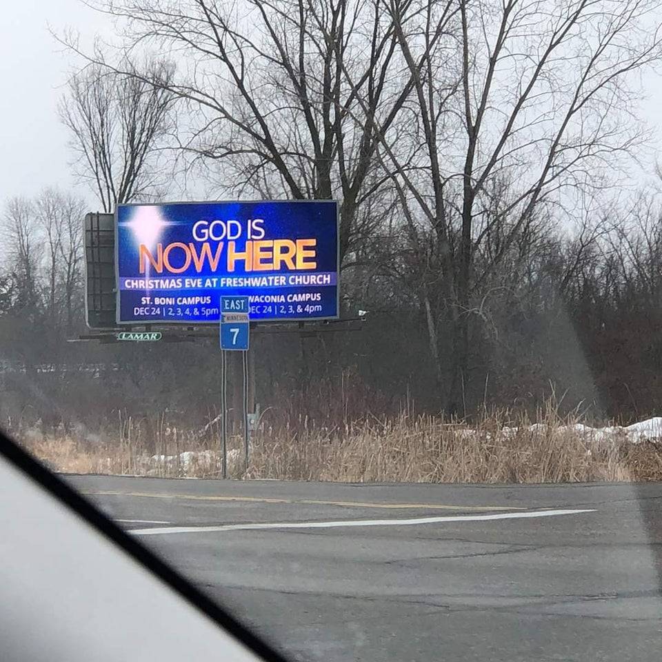 Even if they did bold the “here” it’s still too similar to the text of the “now”. We hope that this sign doesn’t discourage anyone’s beliefs. It’s really just poor sign formatting that you see here.