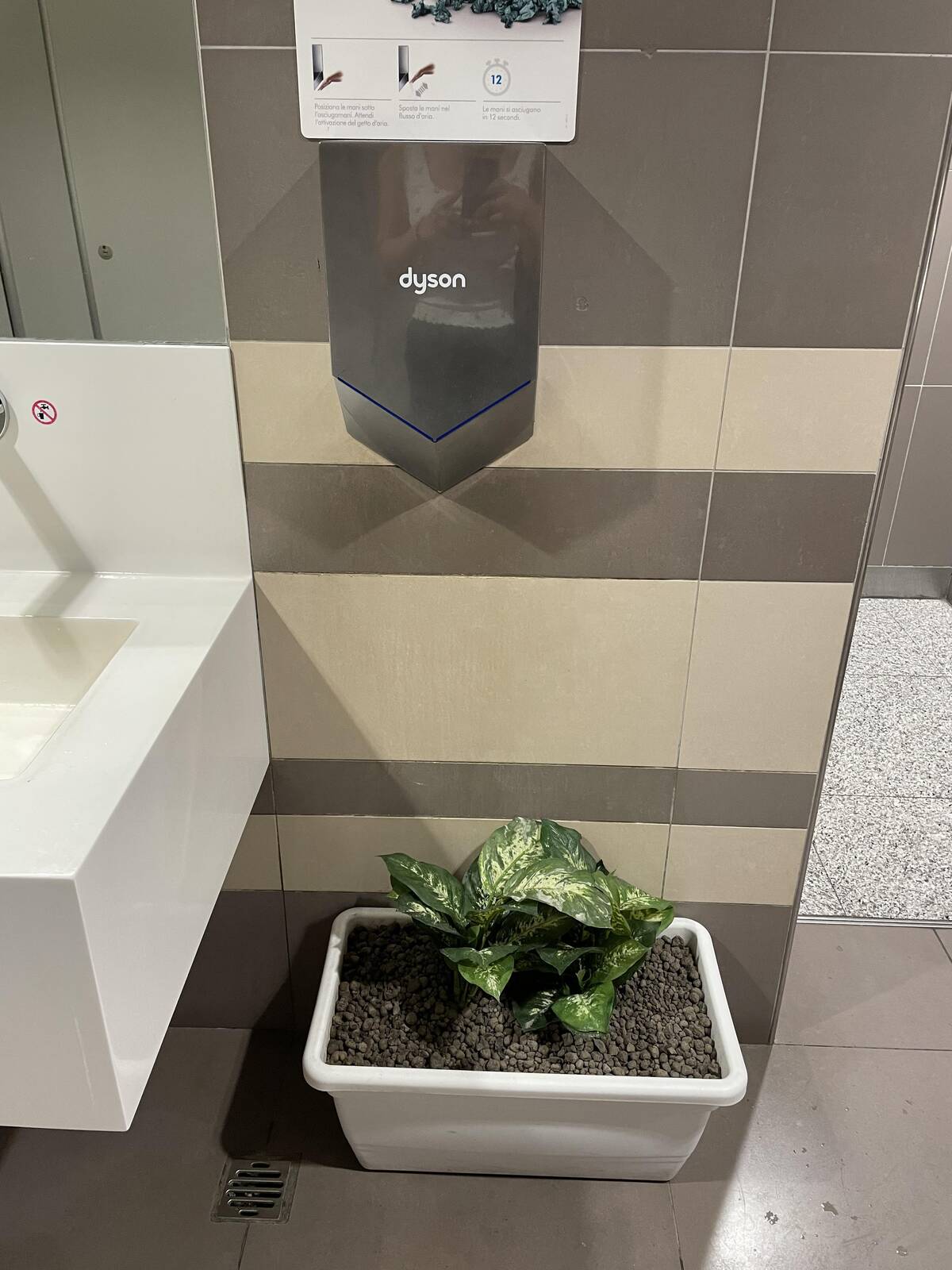 That poor plant—living dangerously right under the hand dryer. Every time someone dries their hands, it’s a blast of wind for this green survivor. Nature meets modern bathroom design, I guess!