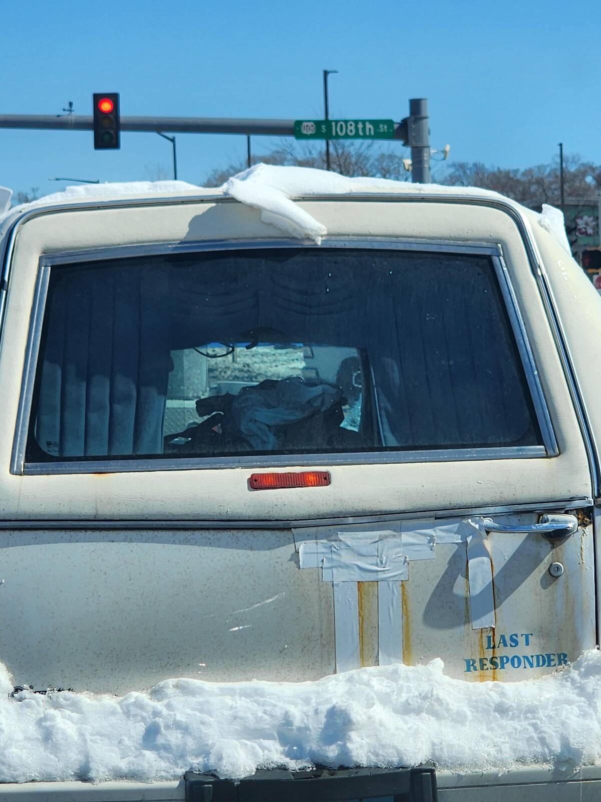 That bumper sticker made me snort—’Last Responder.’ Morbid humor on a hearse is a whole vibe. Whoever is driving has a sense of humor that can brighten up even the dreariest traffic jam. I kind of want to wave at them in solidarity.