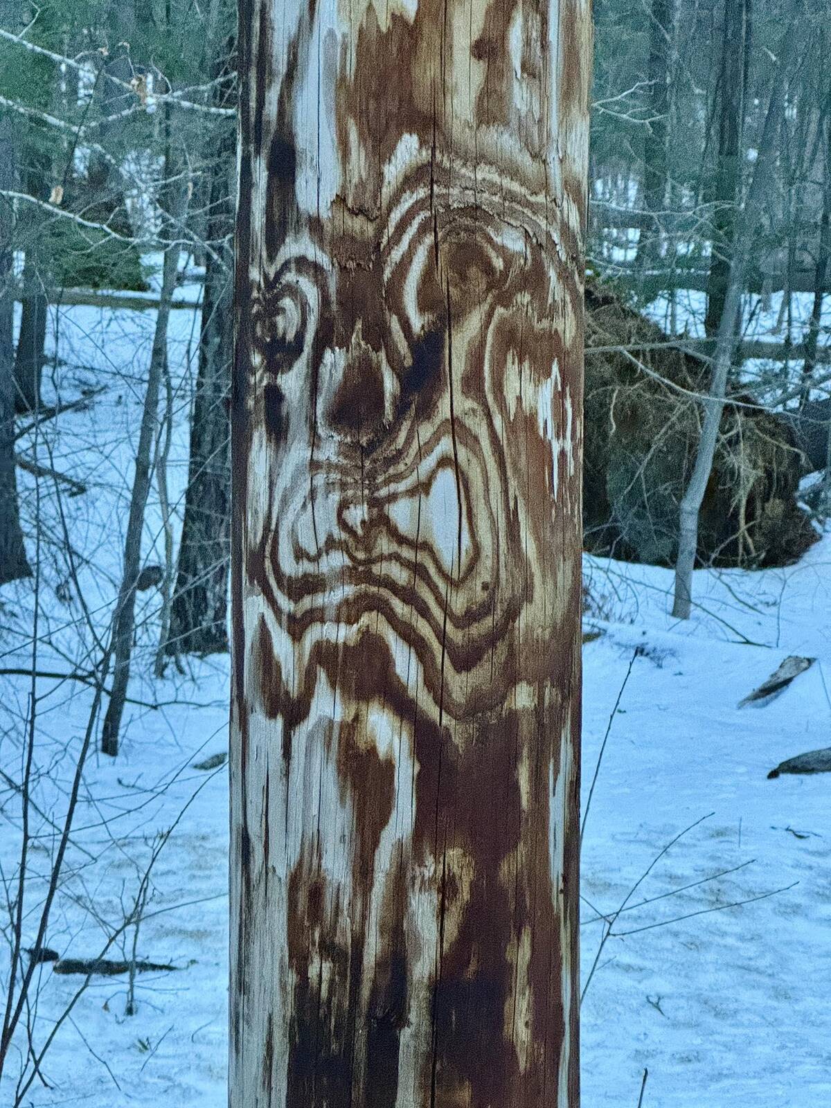 I can’t unsee that! It’s a telephone pole, but the grain lines totally make it look like a cartoon face. Suddenly, this utility pole has a personality—a little cranky, but very memorable. Nature and infrastructure teaming up for some unexpected pareidolia.
