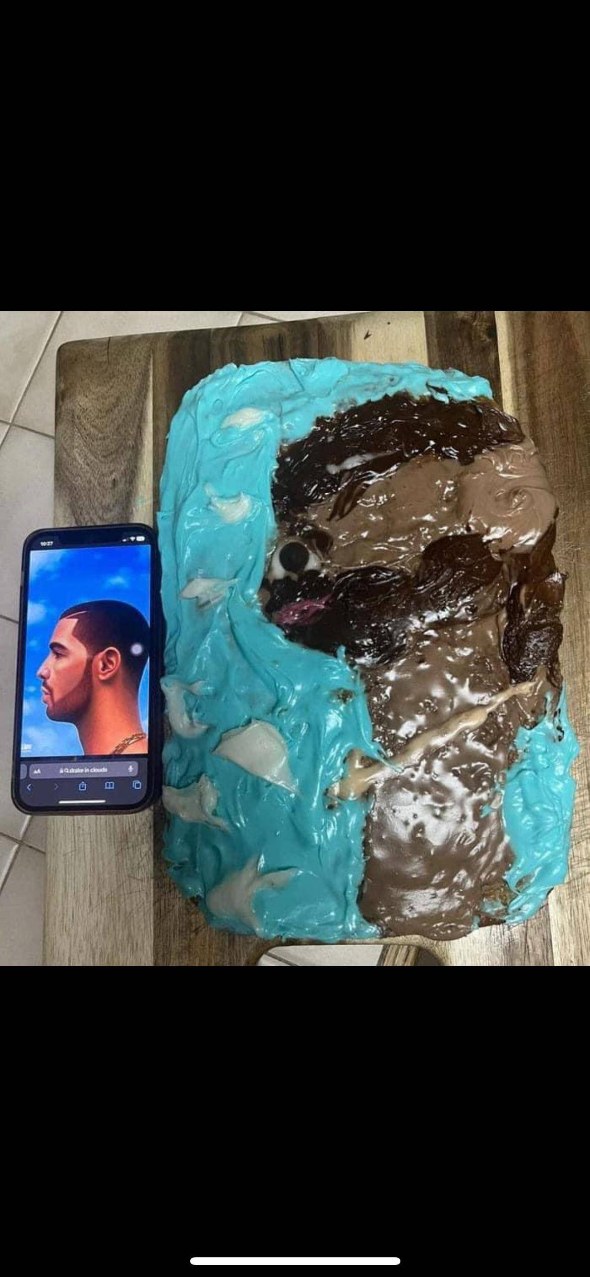 This was supposed to be a Drake cake, but I’m seeing more melted crayons than Champagne Papi. The reference photo only makes the comparison more brutal. There’s beauty in the effort, though, and sometimes cakes are meant to be a good laugh rather than a perfect portrait. It’s the thought that counts.