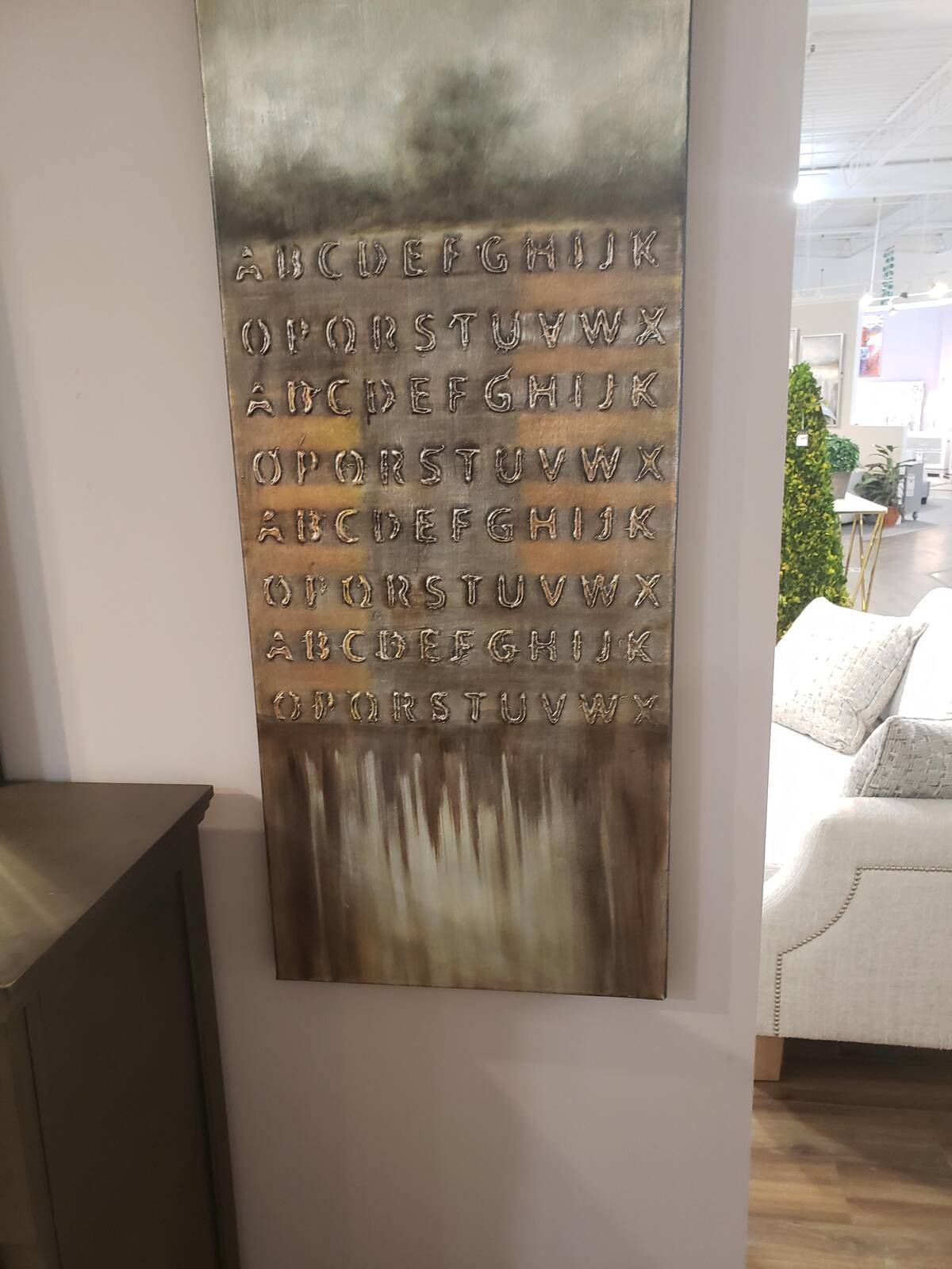 I’m trying to recite the alphabet but I think I need a decoder ring for this art. Where did ‘Y’ and ‘Z’ go—and what’s with the mysterious upside down ‘A’? Who approved this? Maybe this is the alphabet for people who already know it, or a fun way to test your memory with missing letters.