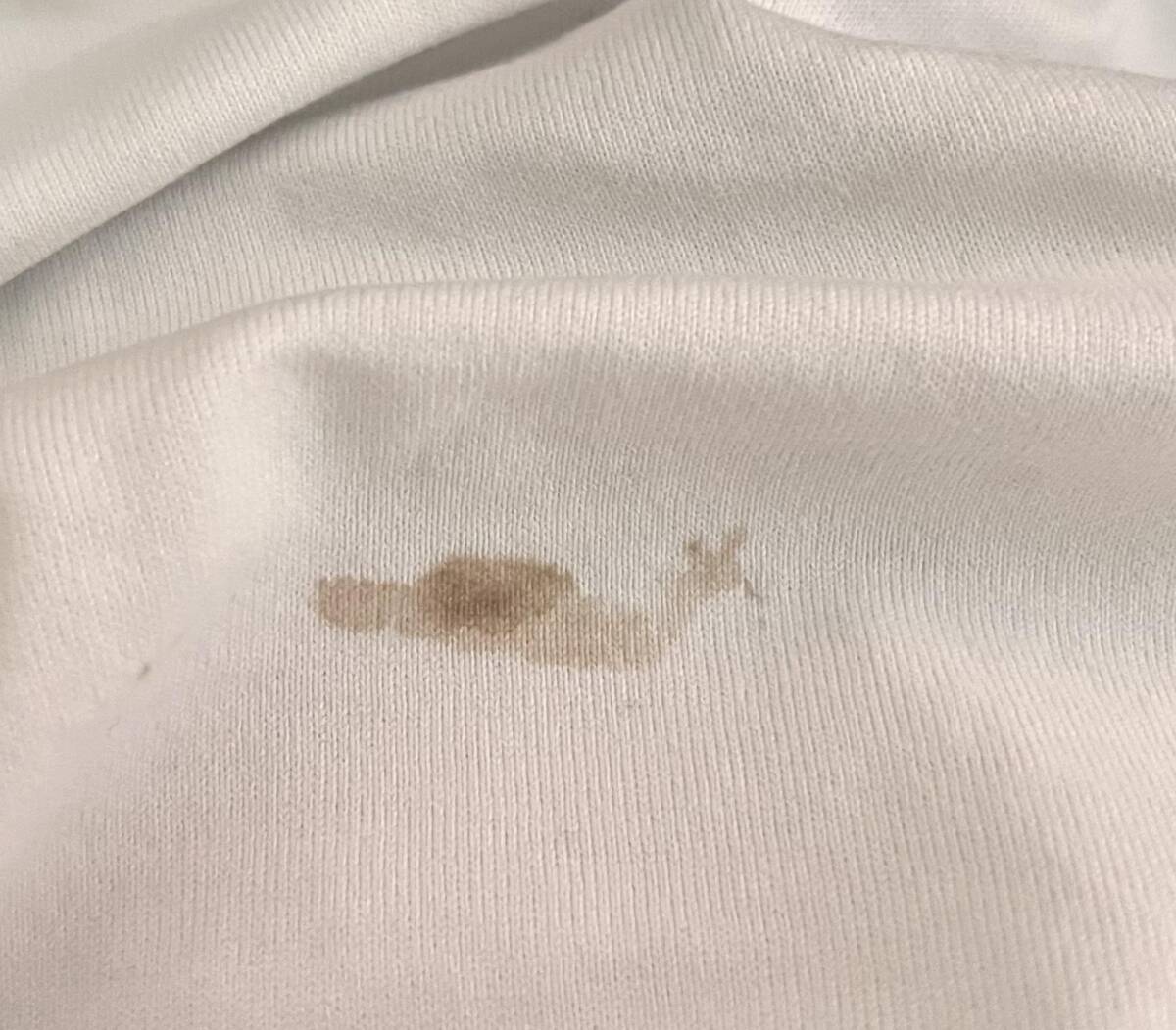 This shirt stain could pass for modern art—it looks just like a tiny snail cruising along. Almost too cute to wash out. Why do spontaneous stains always take the shape of animals and never something boring?