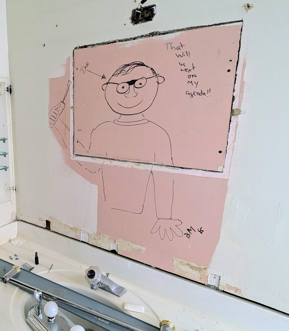Renovating always gives you surprises, but this doodle is next level! It’s like a relic from a secret club of bathroom mirror artists. Whoever drew this was definitely having a good day. The toothbrush detail is priceless.
