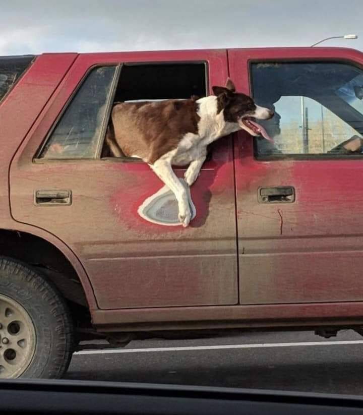 Absolute proof that even metal can get a good petting spot over time! Just look at that dog—the happiest pup, with a car door proudly showing his favorite place. Unmistakable evidence of smiles, tongue-lolling, and miles of rides. The ‘Goodest Boy’ is legendary!