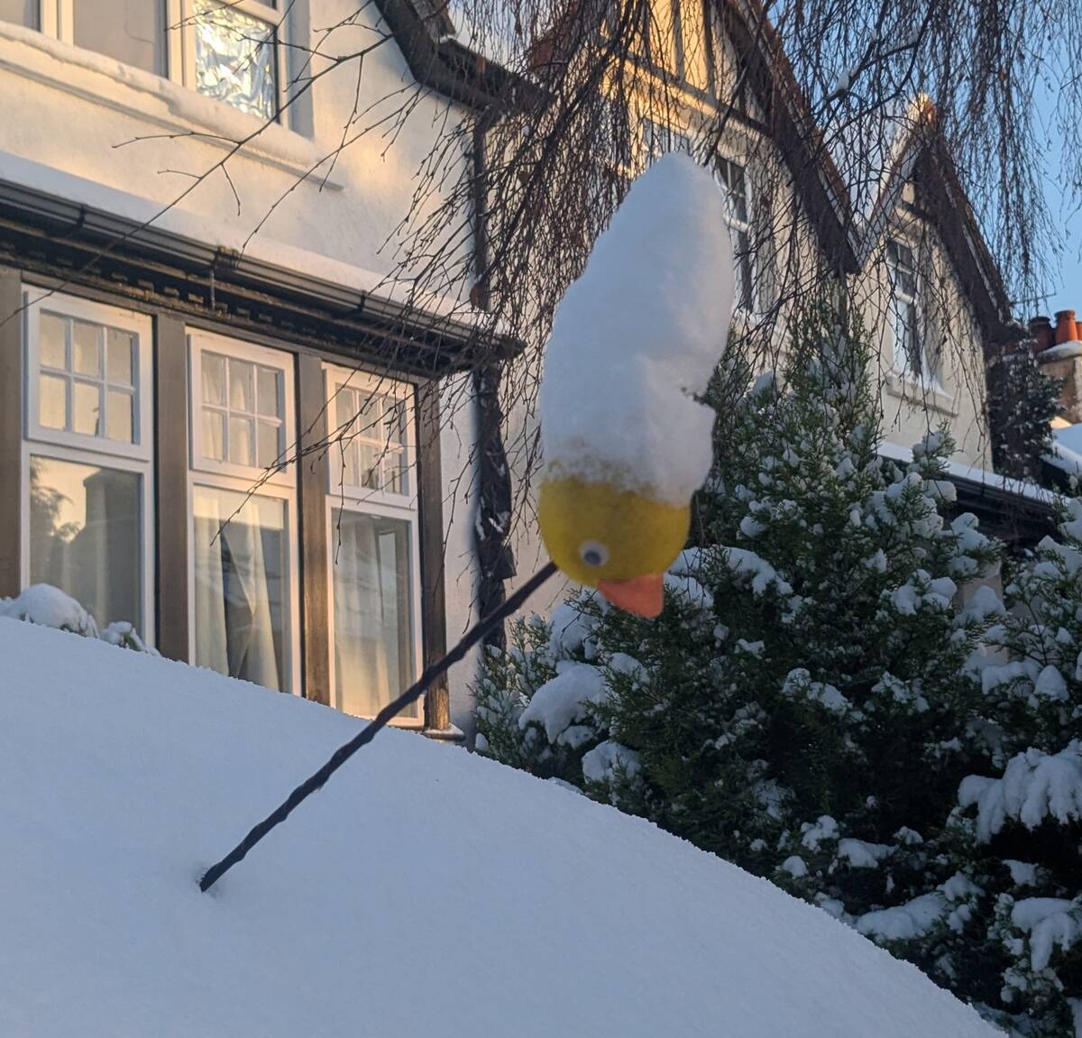 “Snowfall gave my car’s Antenna Duck a hat”
