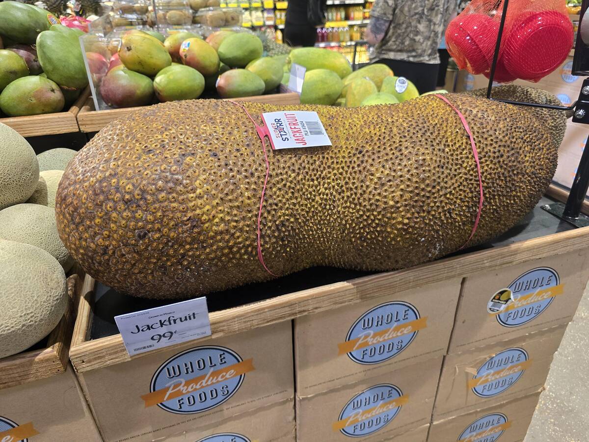 Is that an actual jackfruit or someone pulling a prank with a dinosaur egg at Whole Foods? I don’t even know if this would fit in my cart, let alone my fridge. This thing easily outweighs my weekend haul. Do you need a forklift to carry it out of the store?