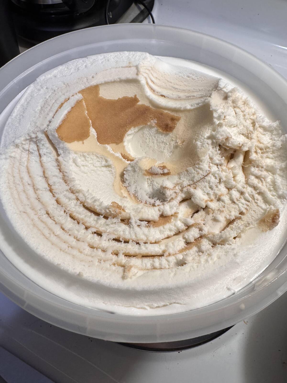 Butterscotch ripple ice milk with the ripples in layers instead of, well, ripples? My dessert turned into a geological cross-section. Digging in feels like an archeological dig. Whoever packed this was not afraid to break traditions… but it’s still delicious.