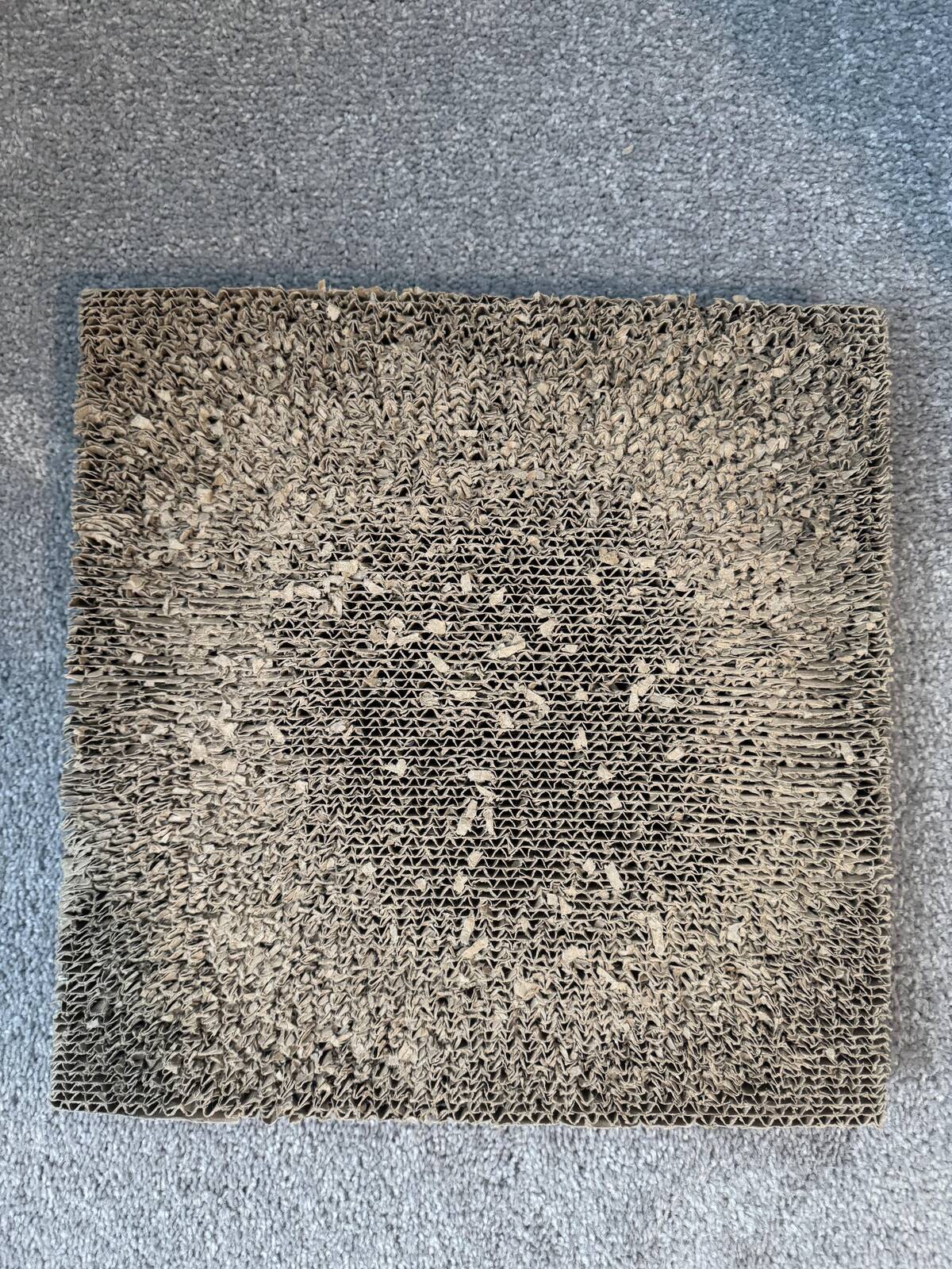 I never realized my cat’s scratching board could become modern art. The pattern of wear is so oddly symmetrical and satisfying. Guess I’ve got a feline with an eye for design—or just one determined to scratch in the same spot every time.