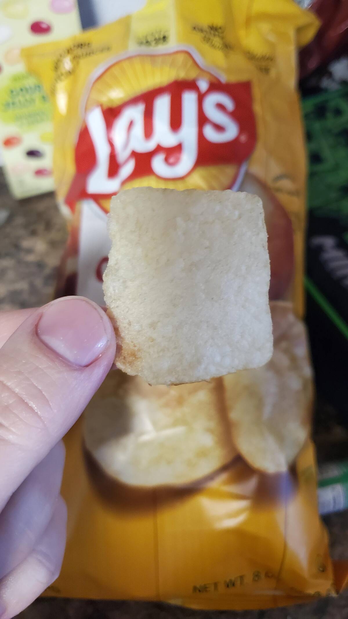 A square Lay’s potato chip in a bag of rounds—did I just win the snack lottery? It’s like finding the golden ticket but crispier. Totally eating this one last, because it’s clearly the special chip. Unexpected snack geometry, I salute you.