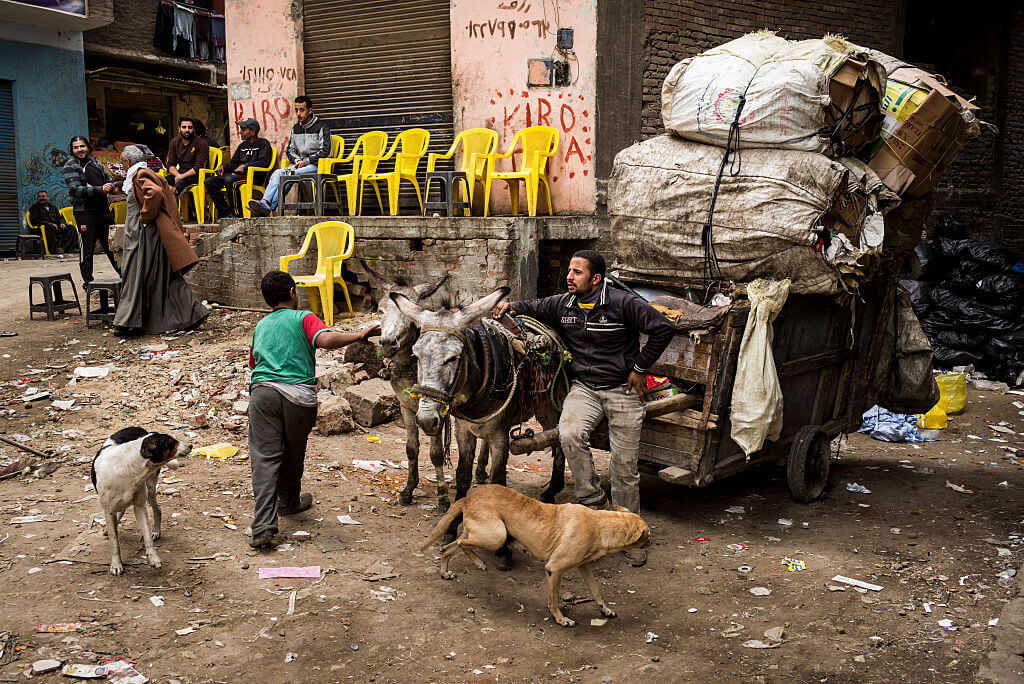 Manshiyat Naser is a neighborhood in Cairo, Egypt, that’s located under the cliff of Mokattam. It’s better known as Garbage City. Most of the families are Zabbaleen garbage collectors and make their living amassing and recycling waste. They sort it by hand and sell it to factories or process the waste into other things.