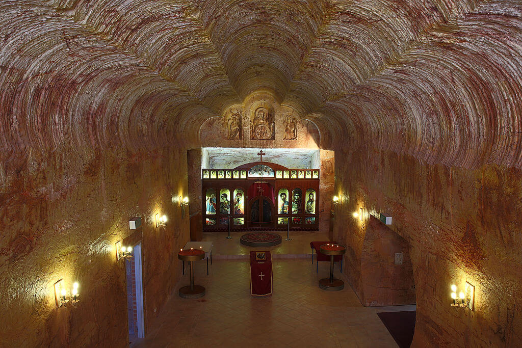 The name of the town is an Aboriginal term that translates into “boys’ waterhole.” Pictured above is the underground interior of the Serbian Orthodox Church of Saint Elijah the Prophet. The church was built in 1993. Crews dug into sandstone to make the structure, and the deepest section of the church is 55 feet underground.