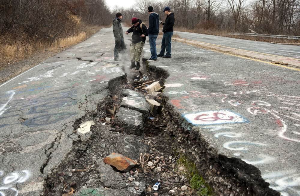 In 1962, an underground coal mine fire changed the landscape of Centralia, Pennsylvania, forever. The fire has been burning underneath the town ever since. Pictured above is a large crack in a closed highway that was caused by the fire. In 1980 there were 1,000 residents. Ten years later, there were only 63 inhabitants. Now there is just a handful.
