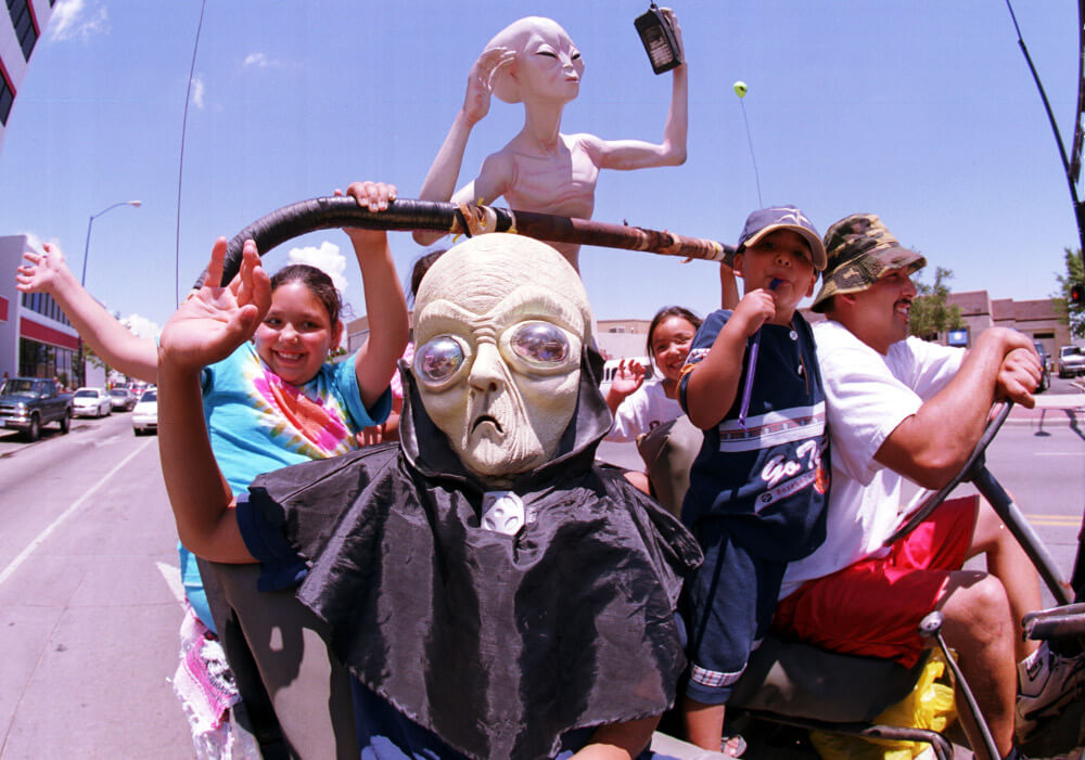 People commonly dress as aliens during Roswell, New Mexico’s, annual UFO Encounter event each summer. In 1947, an unidentified flying disc crashed into the northwest region of the town, and the Army initially claimed it was a UFO before backtracking. The government later explained it was as a balloon crash.
