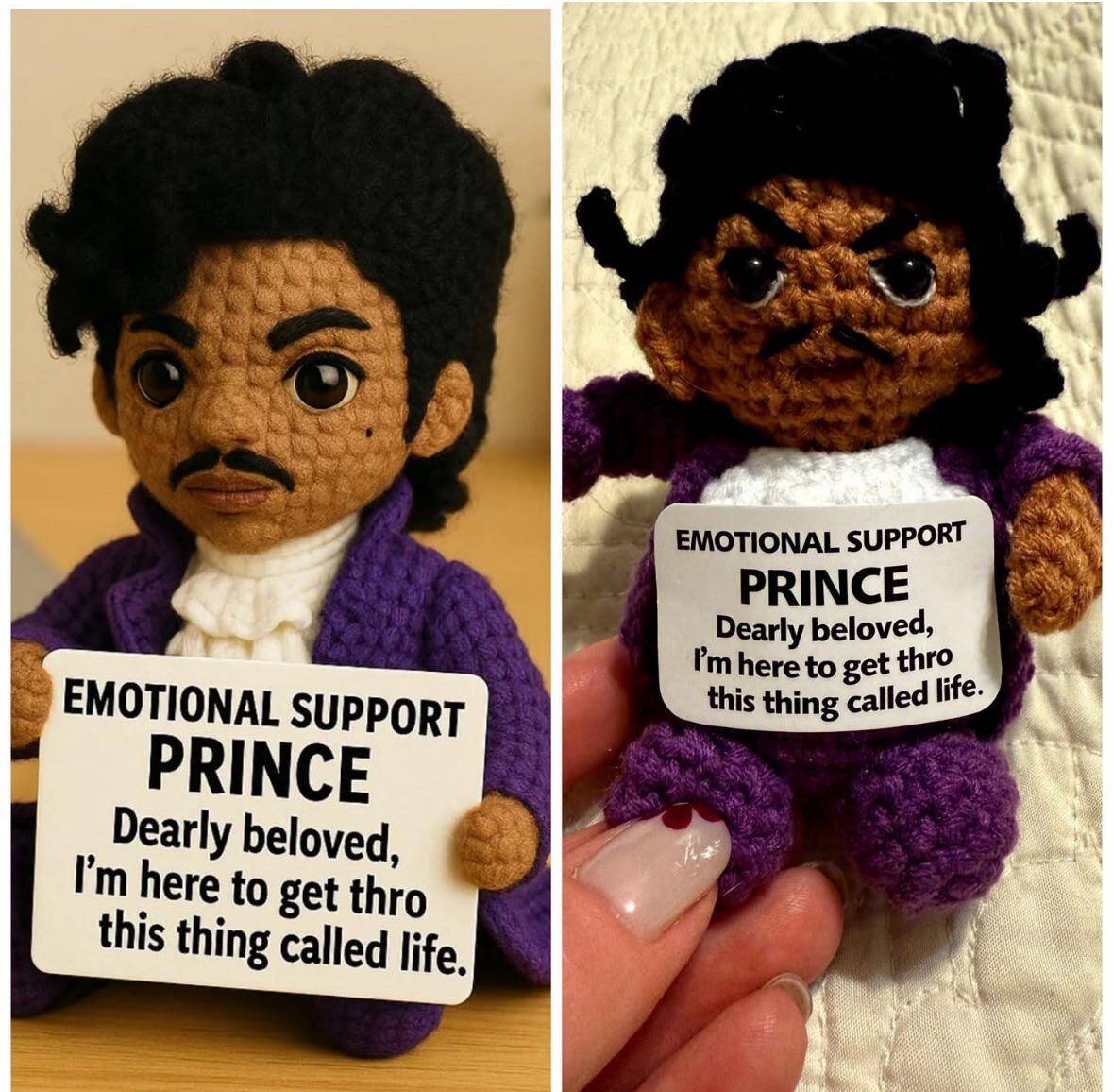 It looks like Prince got a little lost on his crochet journey here! He’s got attitude—just not quite the elegance you might expect from an icon. Still, who wouldn’t want emotional support with this much character? He might not sing, but he’ll definitely make you smile.