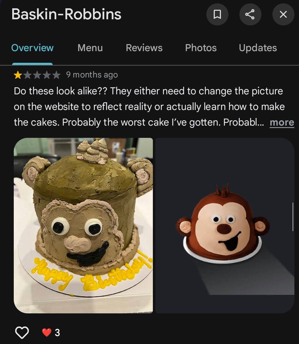 “I asked for a sugar photo birthday cake. I got a horrible hand drawing instead.”