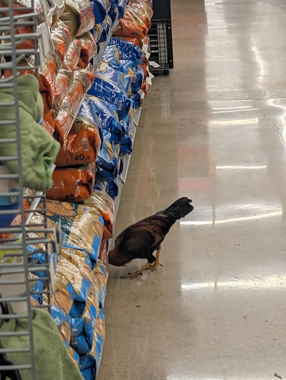 Just when you thought grocery shopping couldn’t get any weirder, there’s a chicken wandering the aisles. Is it looking for snack samples, or maybe just lost? Either way, ten points for surprise animal encounters while shopping.