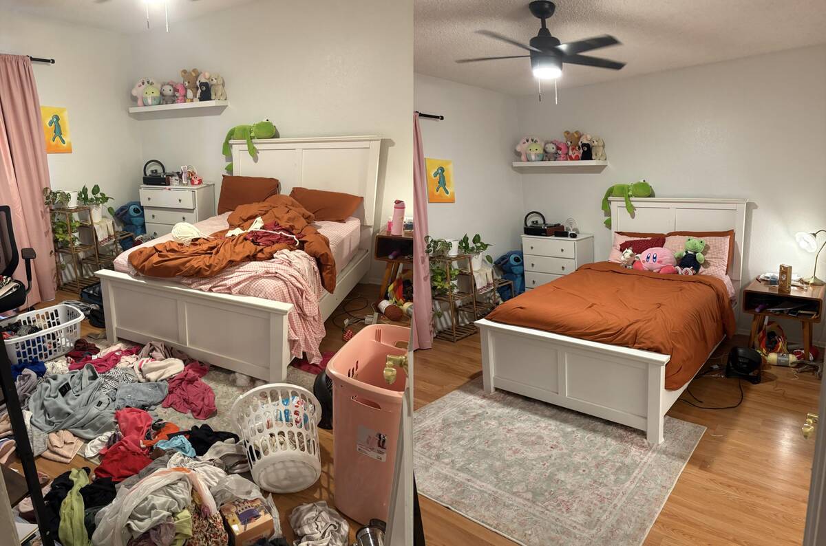 The absolute satisfaction of a before-and-after clean! It’s like watching a transformation montage in a movie—suddenly the space just feels so much bigger and calmer. The plushies on the bed are probably grateful too.