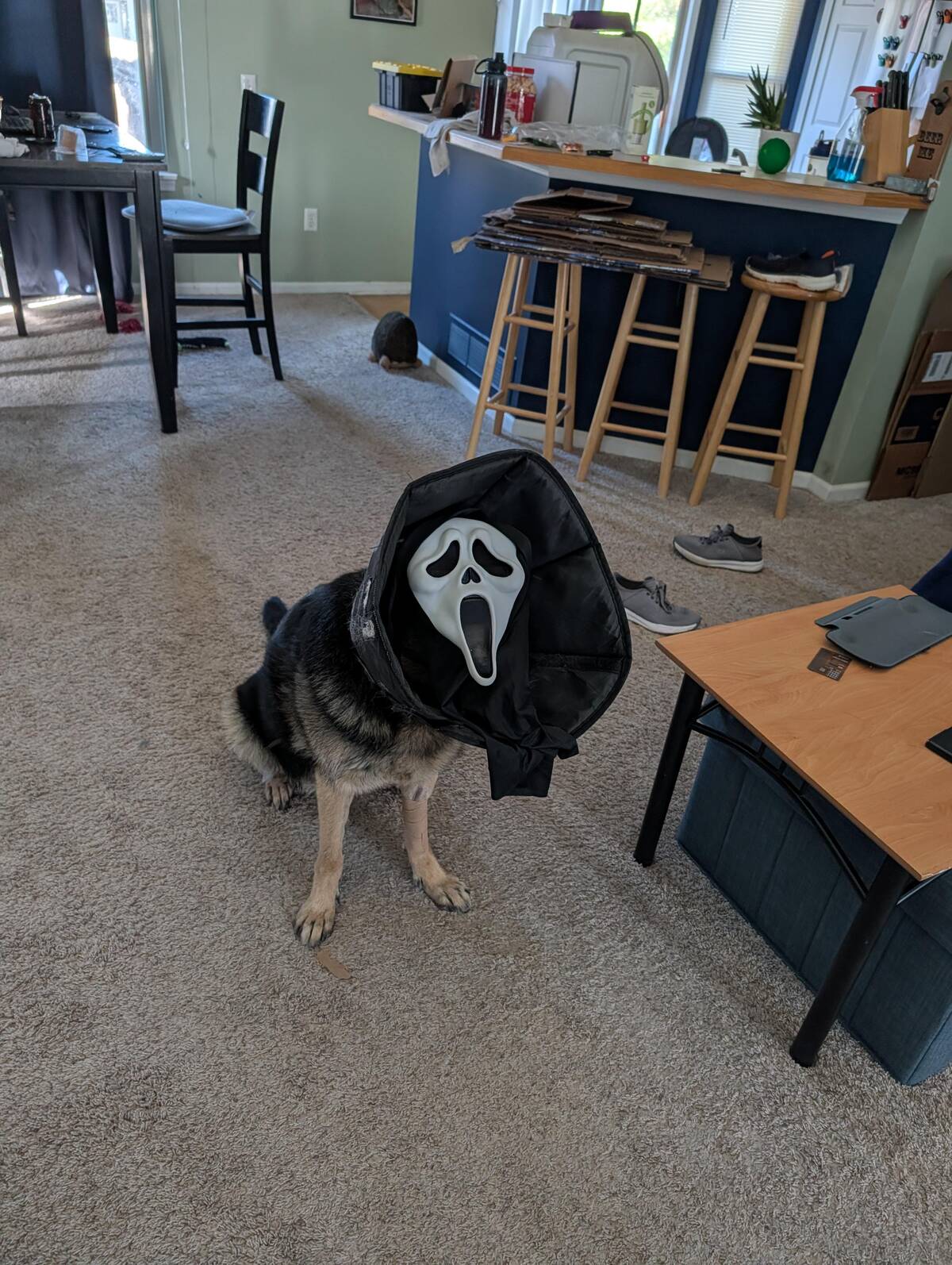 Halloween came early—and this pup nailed it! Ghostface better watch out, there’s a new scream star in town. Scary? Maybe. Still adorable underneath? Absolutely.