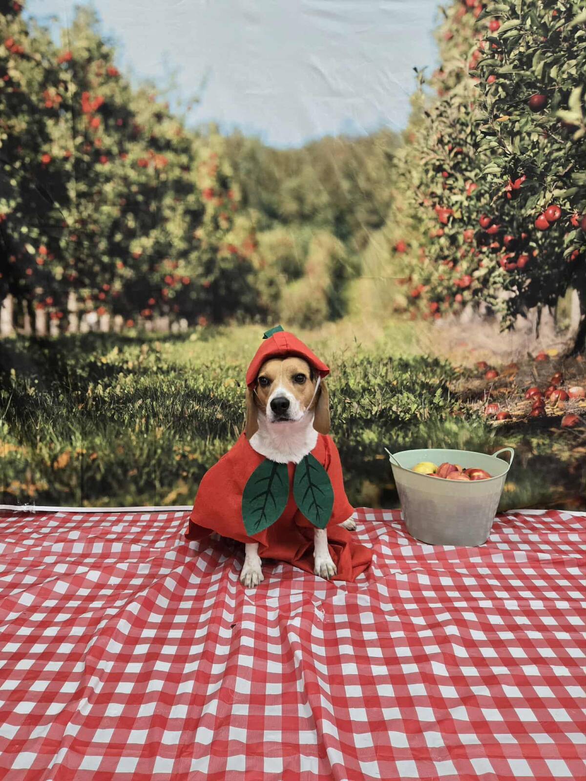 Pet daycare but make it haute couture! This little apple is absolutely owning the orchard theme, from head to toe. Cutest seasonal photoshoot ever, paws down. Enrichment and fashion in one adorable package.