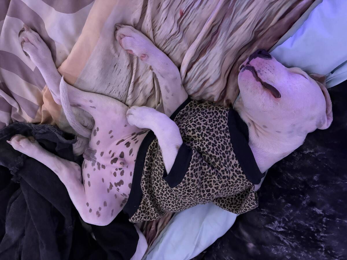Absolute snuggle goals achieved! This pup is so relaxed that you can almost hear the tiny snores through the photo. If there were an Olympics for cuteness while sleeping, this would be a gold medal moment.