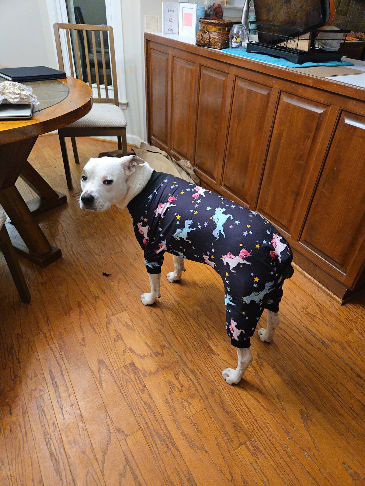 Fashion icon alert! This dog rocks the unicorn PJs and looks ready for a cozy nap or maybe a midnight snack. A chilly night is no match for this bedtime superstar. Pajama party, anyone?