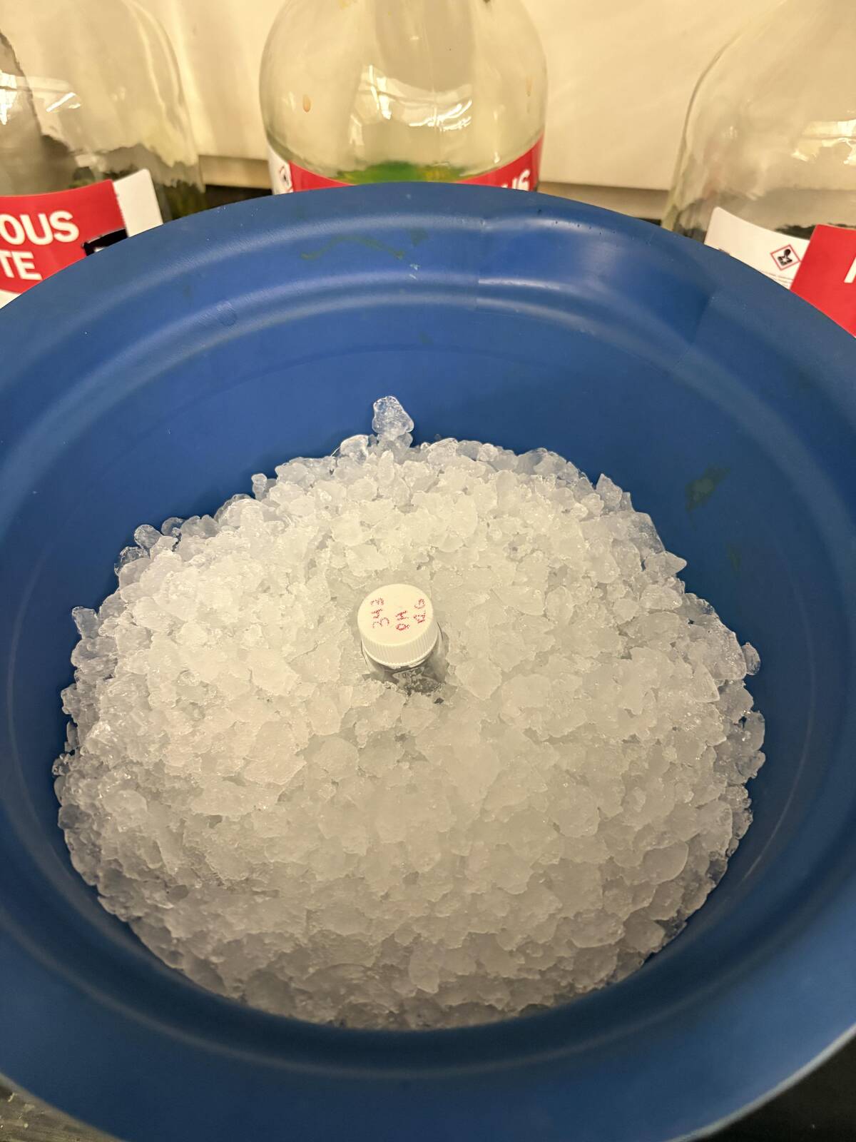It’s like a frosty pile of shaved ice, ready for some syrup and a summer afternoon treat. But the lab bottles in the background quickly remind me: this is not the fun kind of ice. Taste buds, stand down.