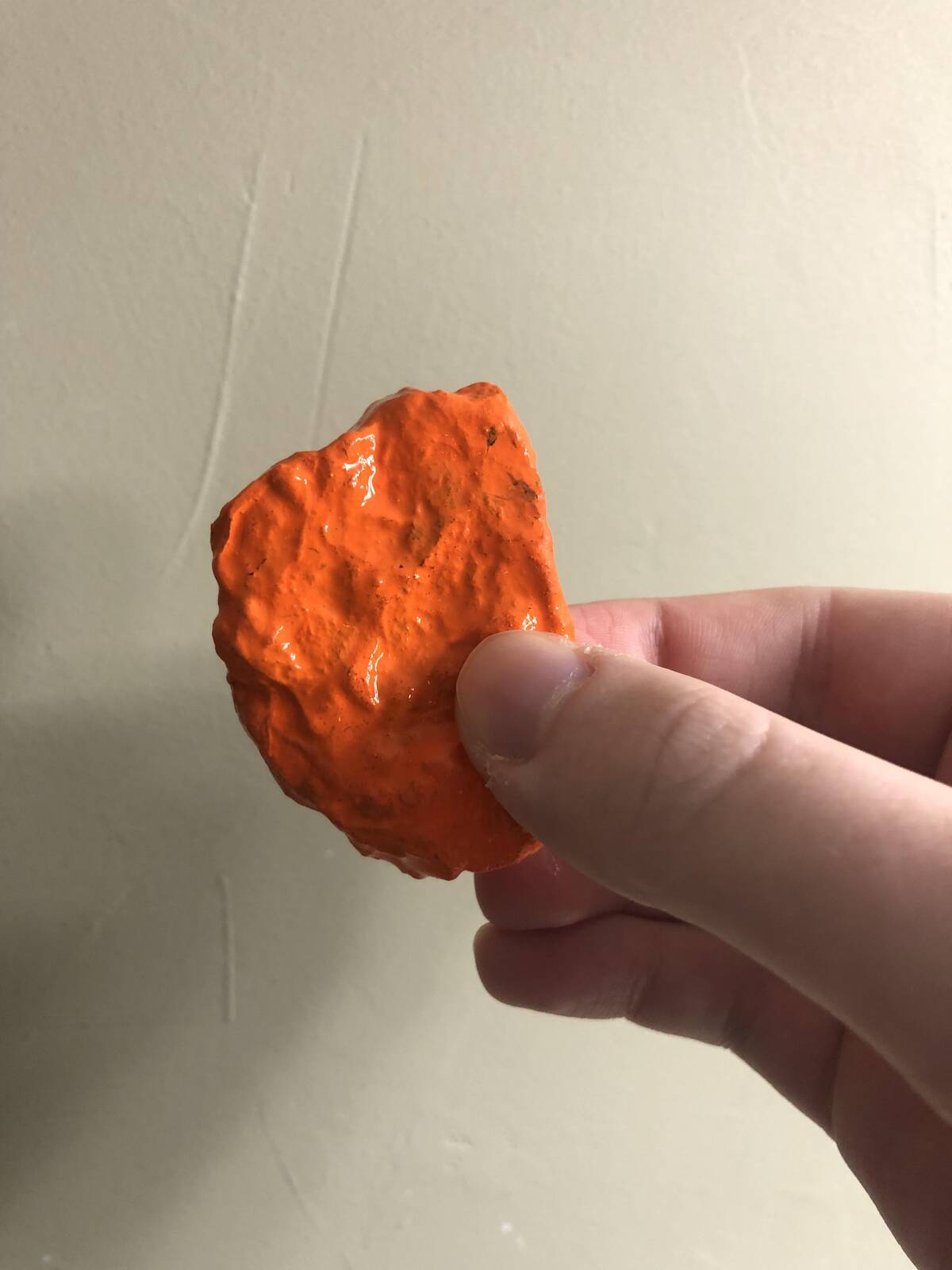That juicy orange nugget is calling to my inner fast food fanatic, but there’s an odd sheen that says, ‘No dipping sauce required.’ Maybe just a rock wearing a delicious disguise. My snack senses feel so betrayed.