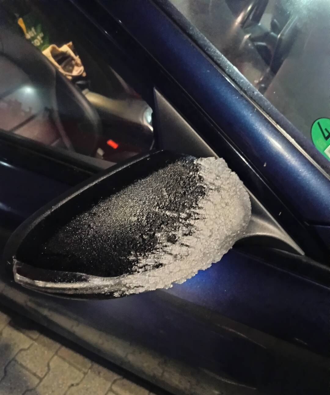 That’s not just frost, that’s a full-on icy beard for this side mirror. Nature’s way of reminding us it has an artistic streak—and possibly a chilly sense of humor.