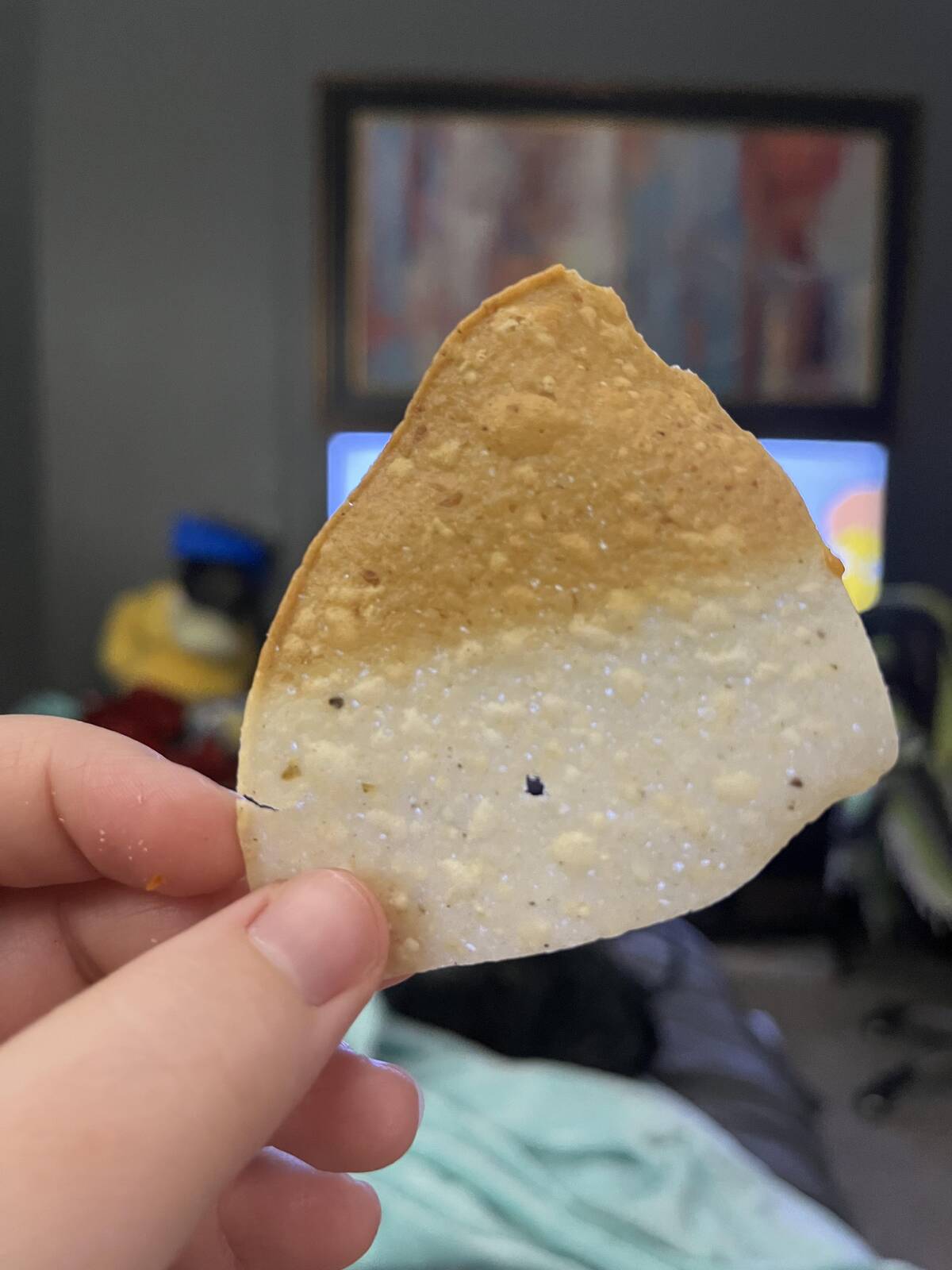 This chip looks like it couldn’t decide which seasoning team to join—so it chose both. A tasty existential crisis in snack form. Now I’m wondering which side tastes best.