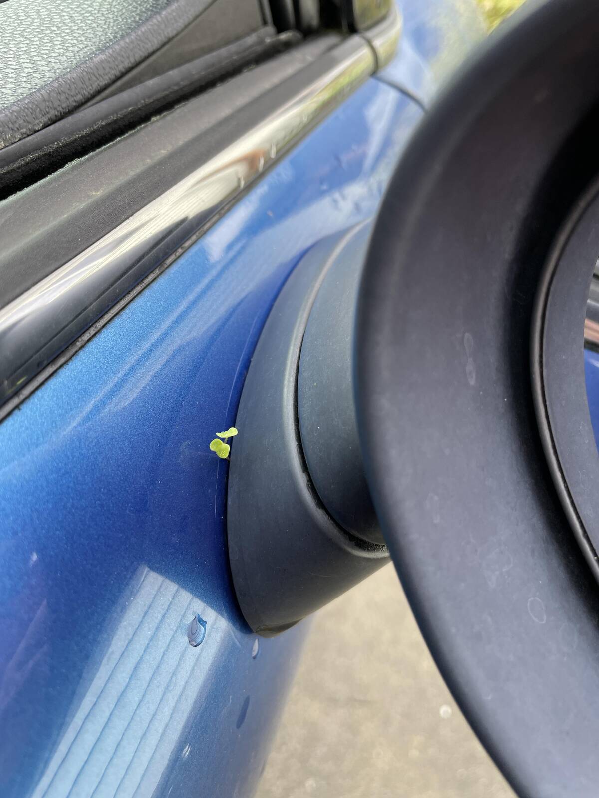 Is that a clover growing out of a car’s mirror? I hope that brings twice the good luck, and maybe a reminder to give the car a wash. You never know what’ll sprout next.