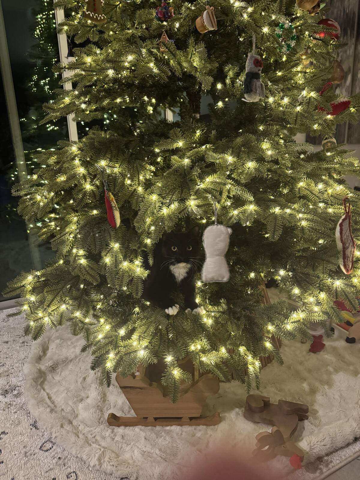 Apparently, the ultimate Christmas tree ornament is furry, curious, and slightly mischievous. Blends right in! The real holiday spirit: paw-sitive chaos under the tree.