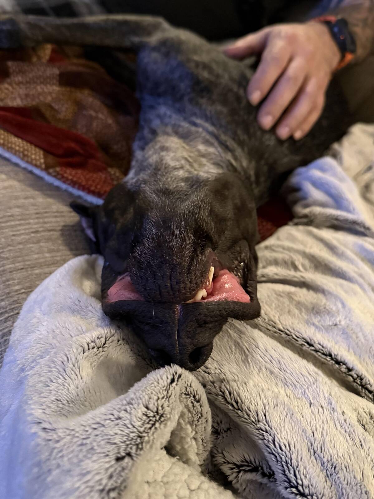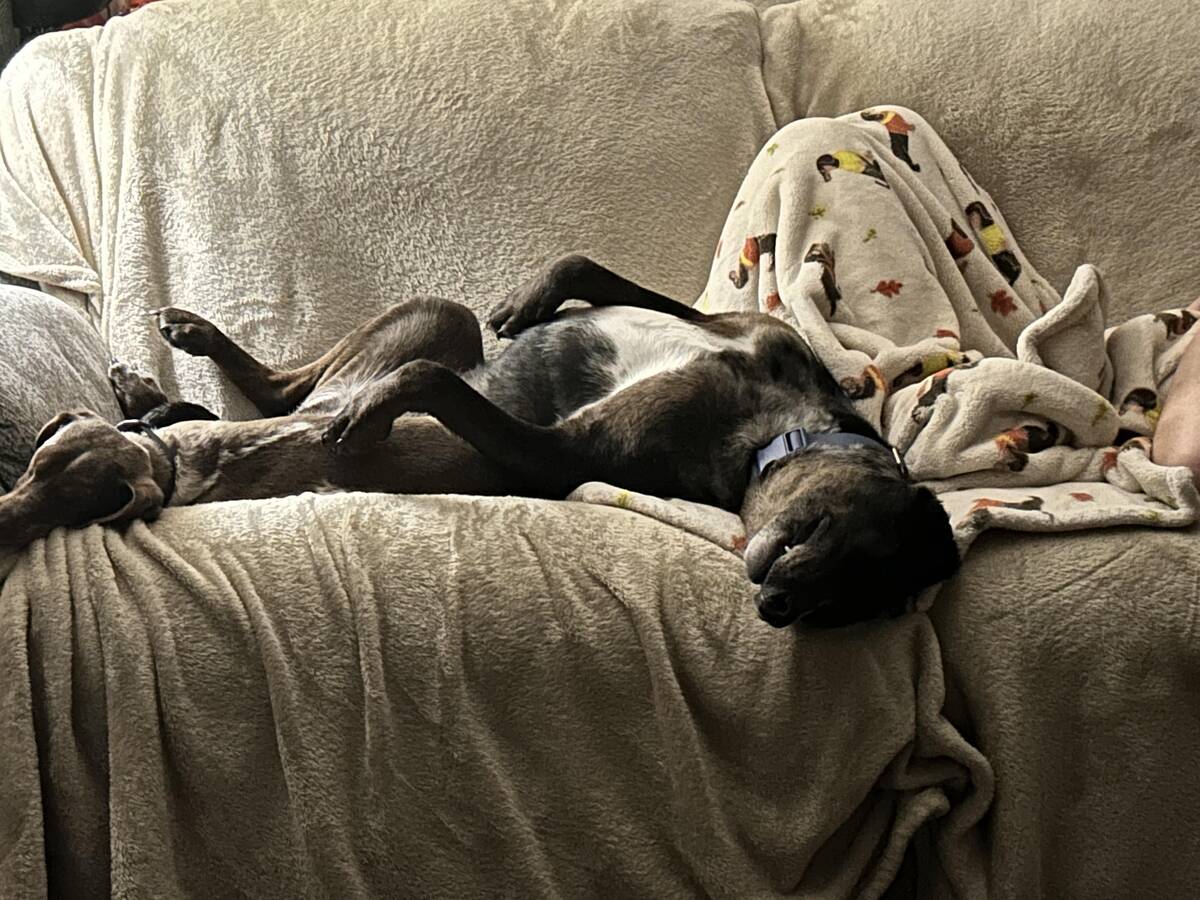 Apparently, the rules of sleeping on the couch are made up—and this dog is the rulebook. Who sleeps like that? Pets do, and frankly, we all wish we could pull it off.
