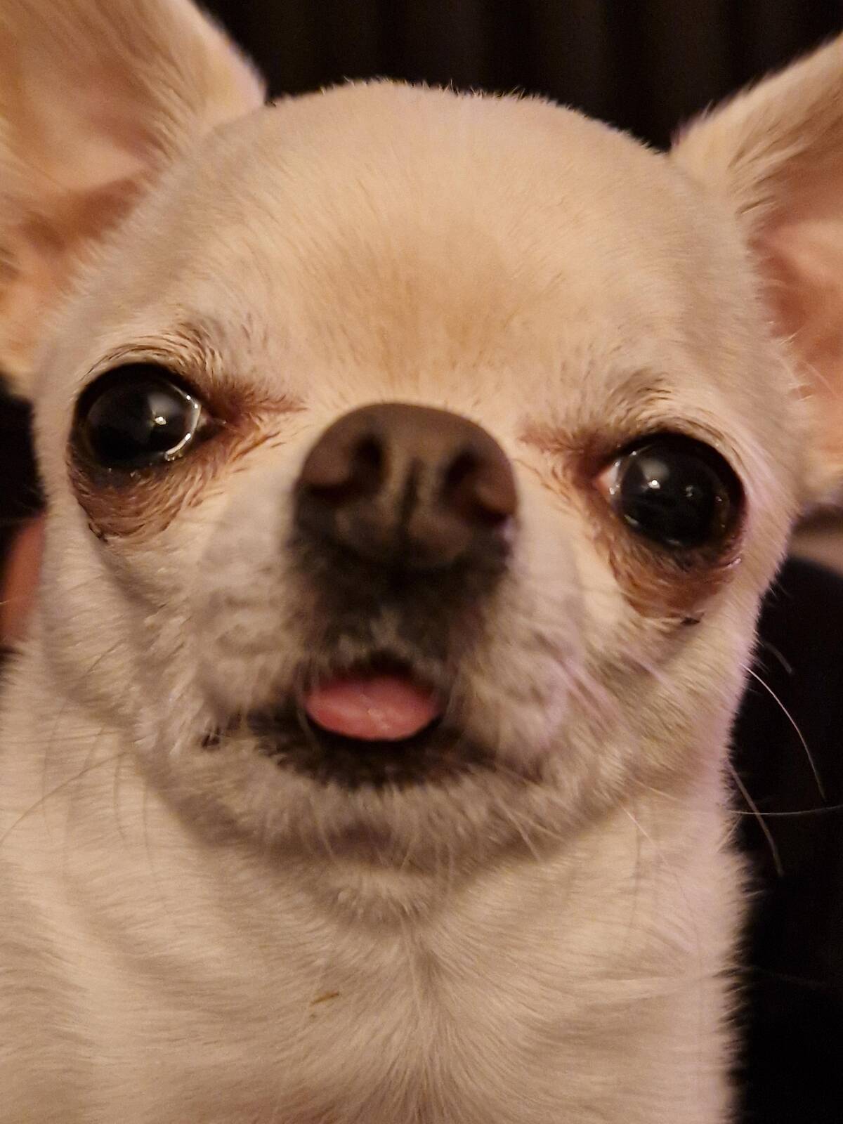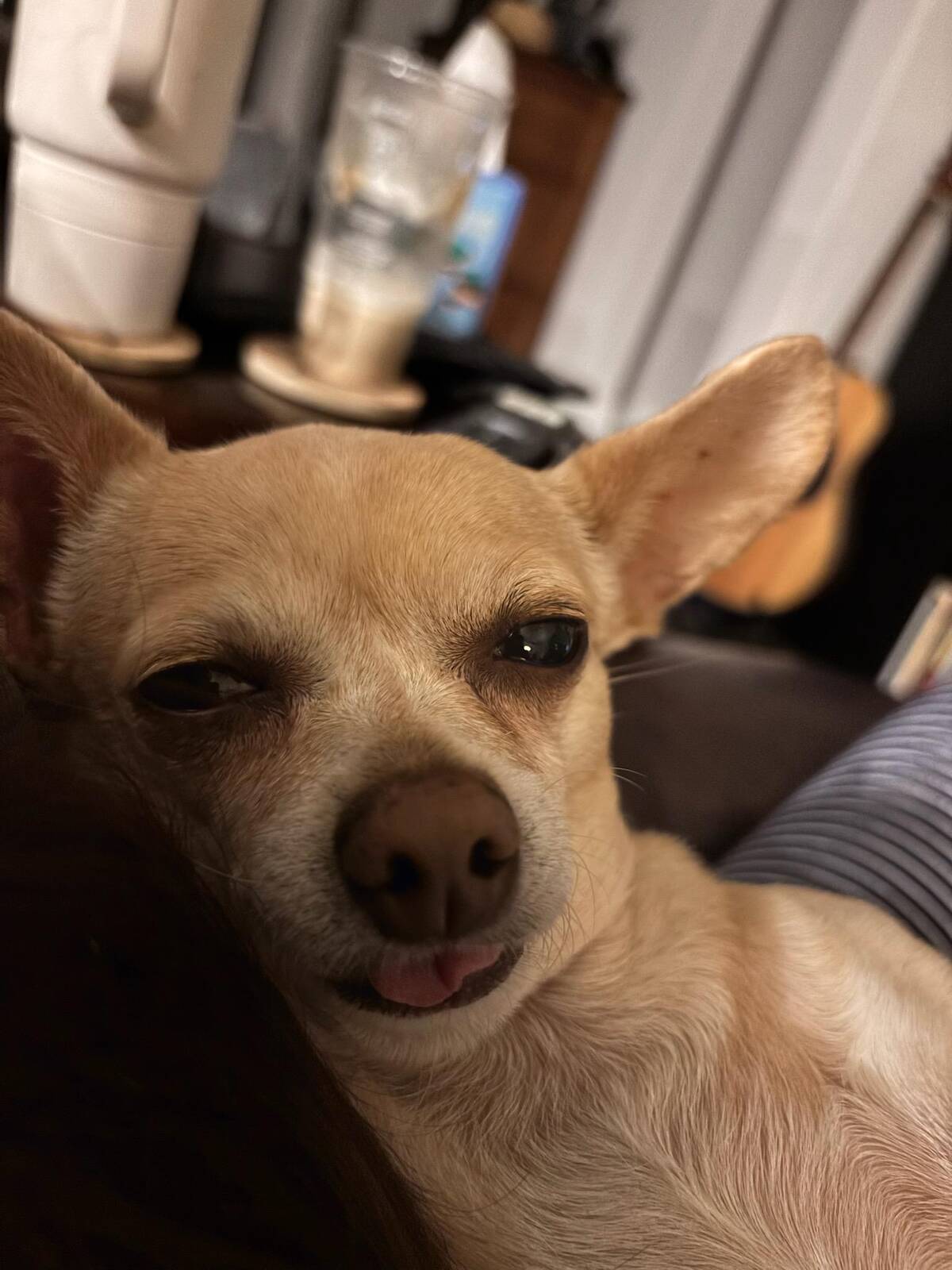 Never thought I’d see the legendary “tiny tongue out” paired with “Saturday night mood.” The vibe is immaculate. This pup’s expression is the definition of ‘I stayed up way past my bedtime.’ Somebody get this dog some pajamas and a blanket!