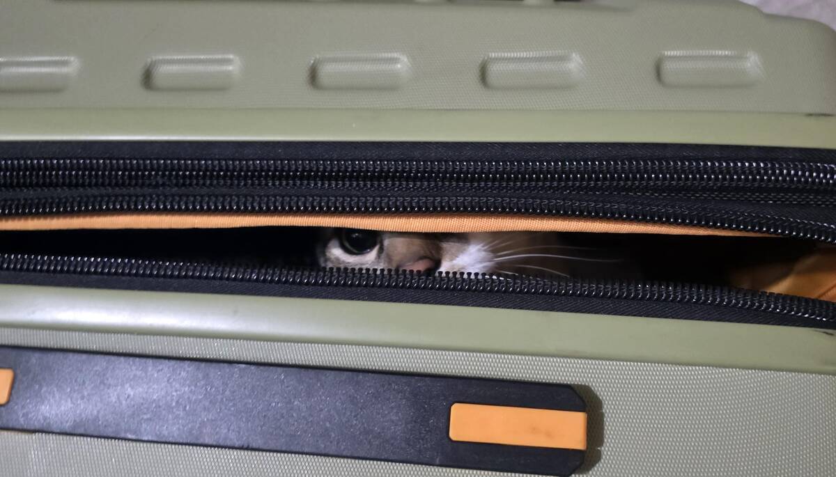 Packing a suitcase with a pet nearby is a tactical challenge. This side eye says, “I saw what you did. You better have a return ticket.” That sneaky little face peeking out of the zipper—pure ‘I go too?’ energy. Who could ever say no to that?
