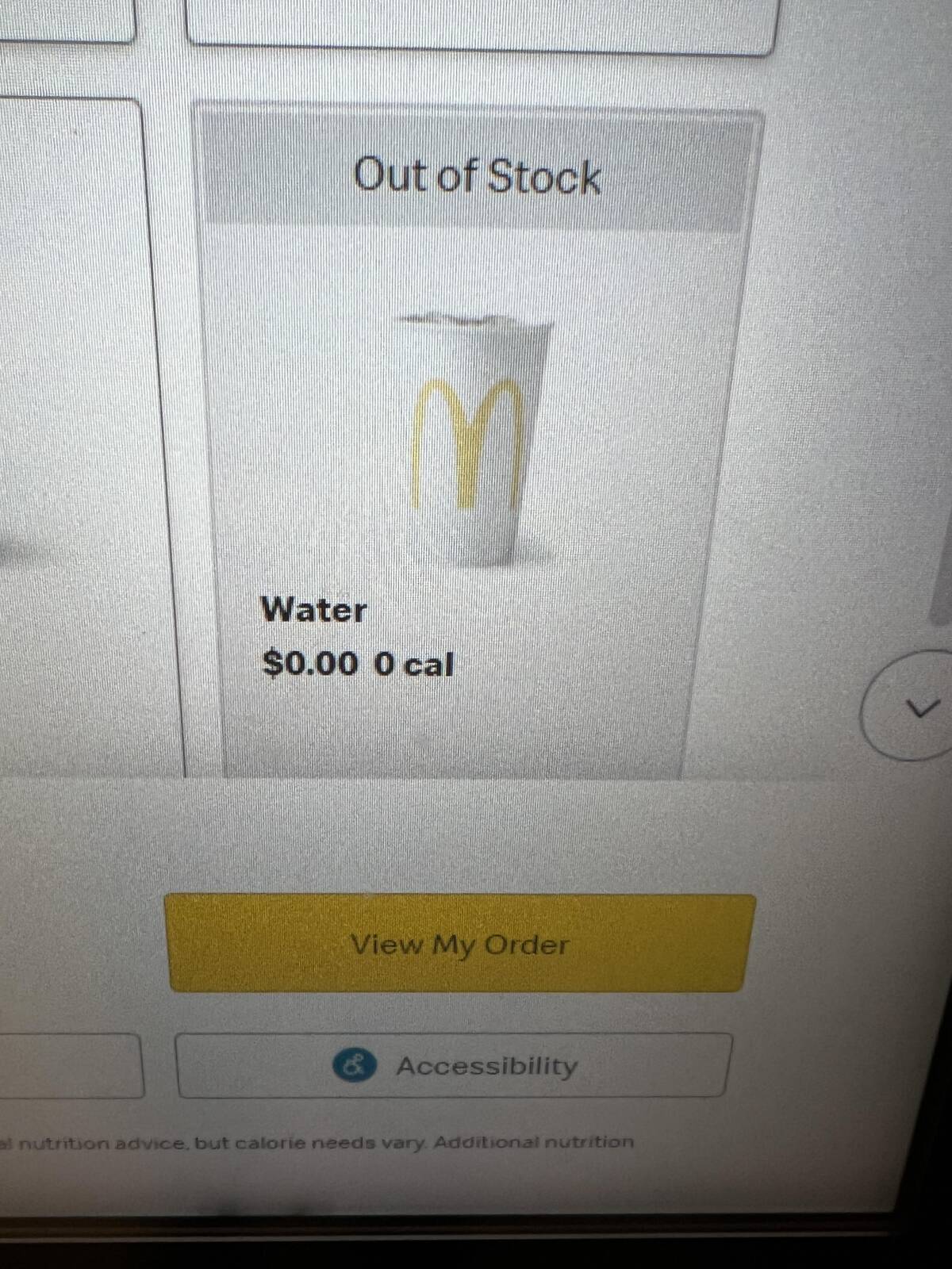 Ran out of fries or burgers? Sure. But water? How is water even ‘out of stock’? This is a new, very specific type of thirst trap. I guess dehydration is the new normal, at least according to the kiosk.