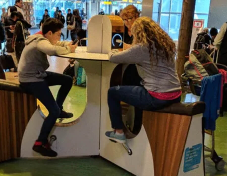 These phone charging stations are productive because to actually get your phone to charge, you have to petal like you’re on a bike.