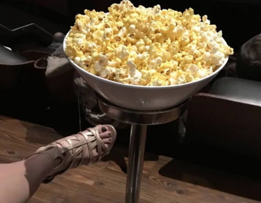 This is very important and we don’t want to bury the lede here. A good movie theater has A LOT of leg room. As you can see, this one does.