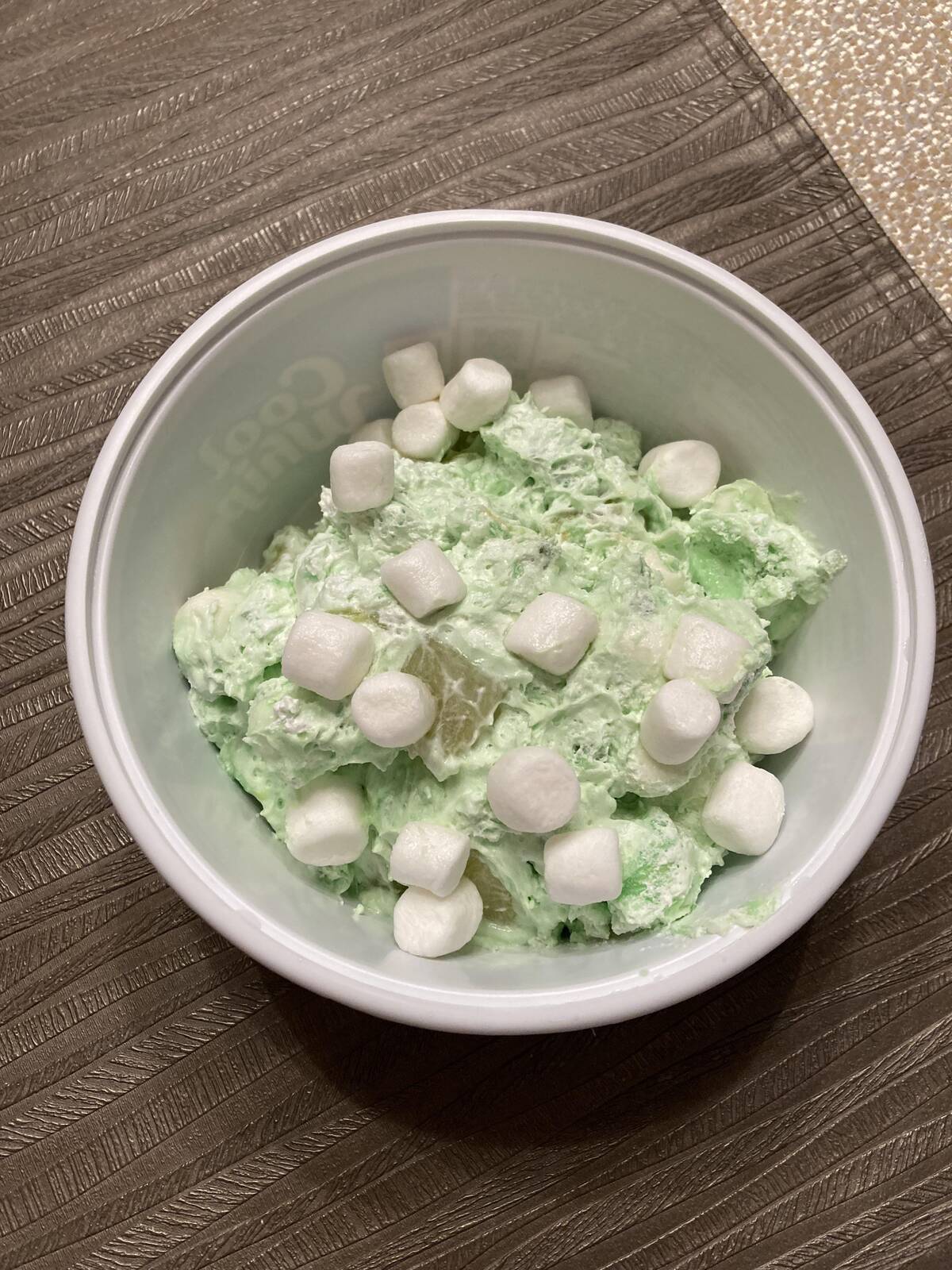 Neighborly gifts usually mean cookies, but this neon-green, marshmallow-laden creation is in a league of its own. Do I eat it, analyze it, or submit it for a science fair? Either way, I’ve never had dessert quite like this—it’s actually a Watergate salad, a sweet, pistachio-flavored dessert made with marshmallows, pineapple, and whipped topping.