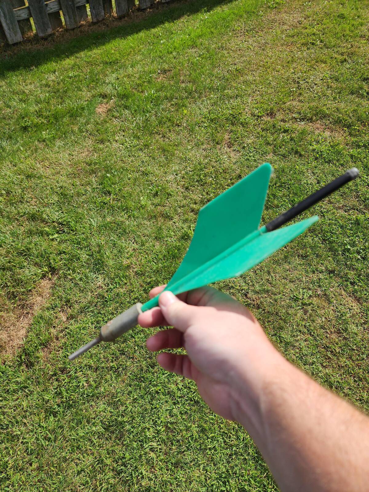 “Appeared in my back yard. Green plastic thing resembles an oversized dart”