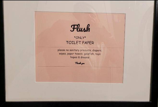 Please, only flush toilet paper—no goldfish, toys, or your dashed hopes and dreams. Finally, a sign that gets how tempting it can be to throw it all away.