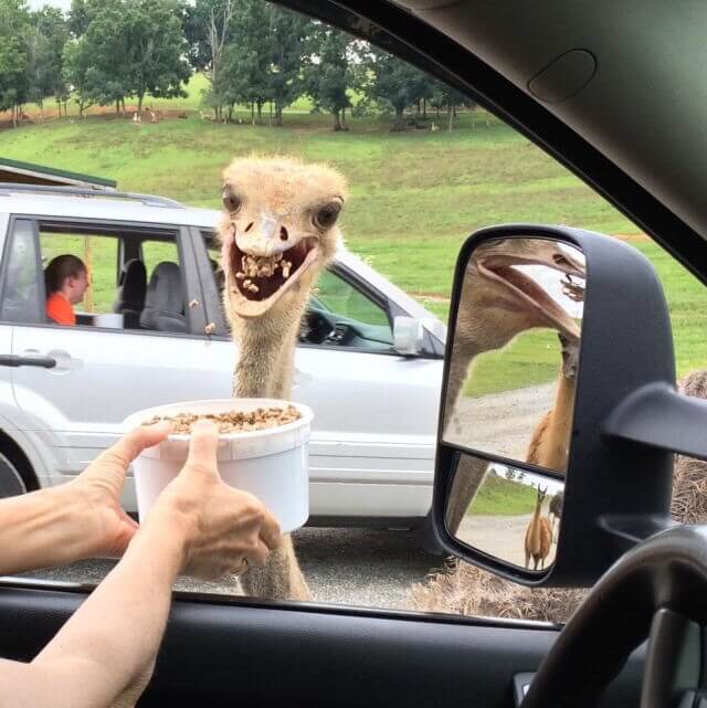 Altogether, there’s more than one thing to laugh about in this picture. Our favorite part is the goofy look on the ostrich’s messy face as he intimidates the people in the car.