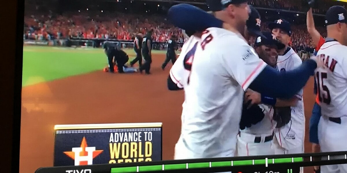 Baseball fans, here are two things you should know. First, don’t EVER jump onto the field the second your team is headed to the World Series. Secondly, security will be all over you. In fairness, the fan is just psyched about the Astros playoff run after all the city went through.