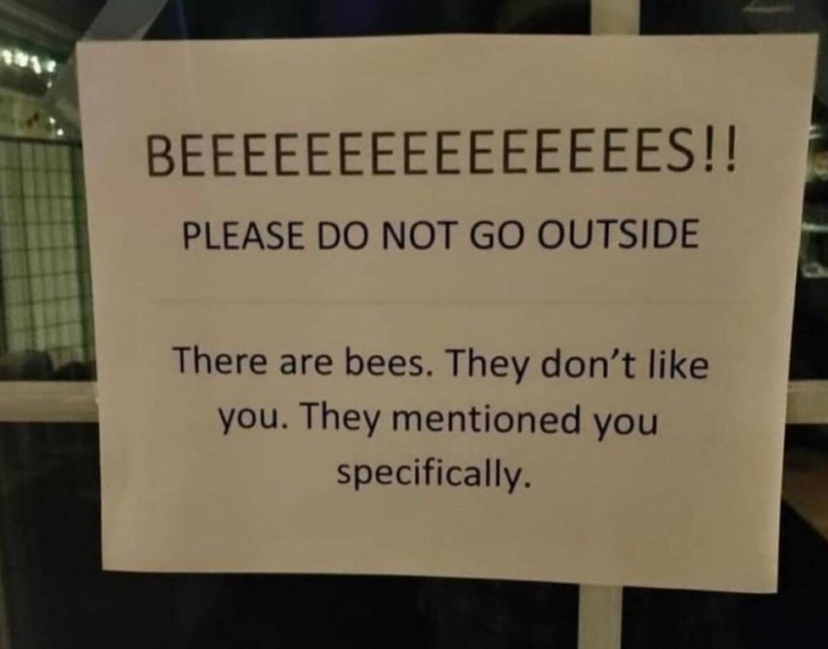 How did a simple warning about bees get so personal? If you’re reading this and feel targeted, maybe stay inside. I’m not about to cross angry bees—especially ones that have apparently singled me out. The high drama makes it impossible not to laugh.